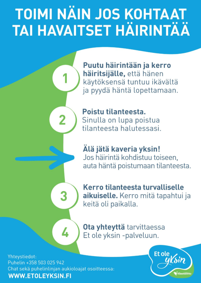 Jos näet tai koet asiatonta häirintää, ota välittömästi yhteys häirintäyhdyshenkilöön tai luotettavaan aikuiseen. Lomake nettisivuilla